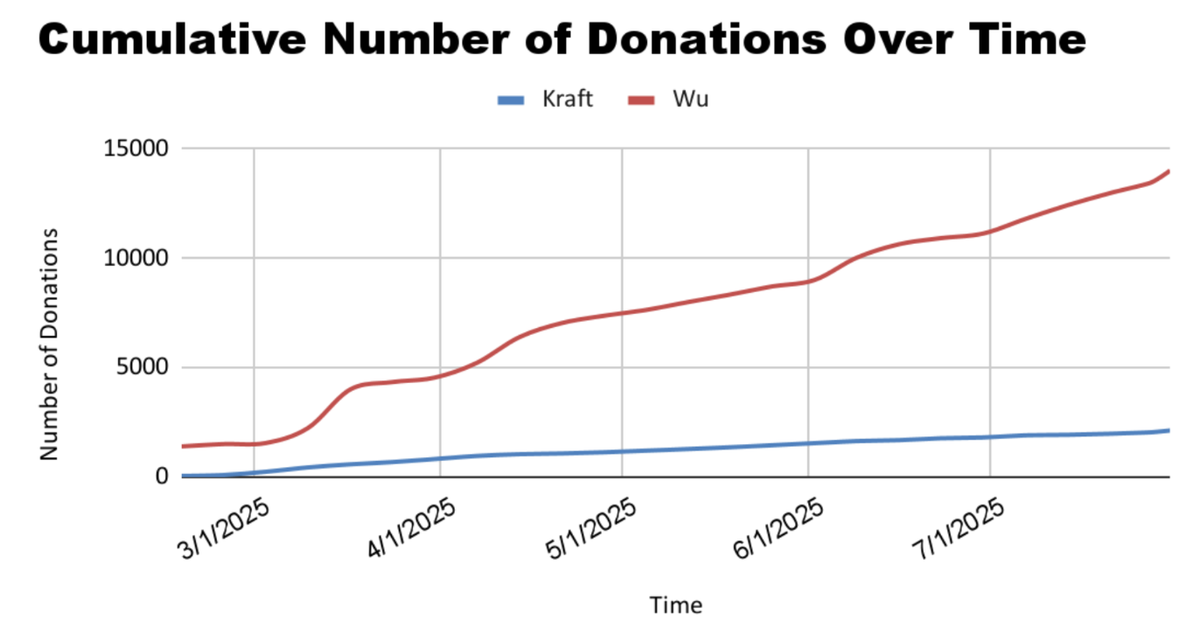 Analyzing total donation amount over time, Kraft’s donations also seem to have a consistent and steady pattern. Kraft’s $2 million self-donation was excluded to better visualize the trend of his external donations over time. Notably, even with this large donation, Wu’s campaign still maintained steady contributions during this period—suggesting that Kraft’s spike in donations did not interfere with her grassroots efforts and support.