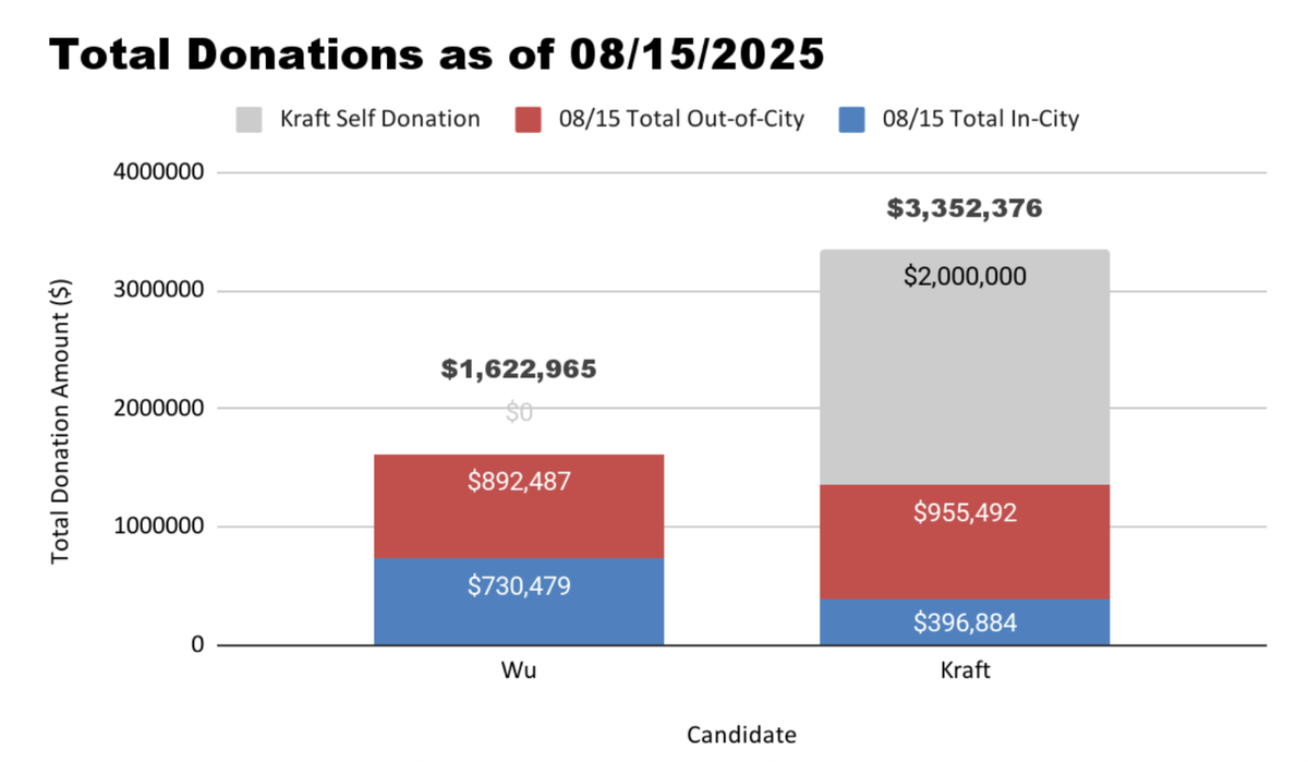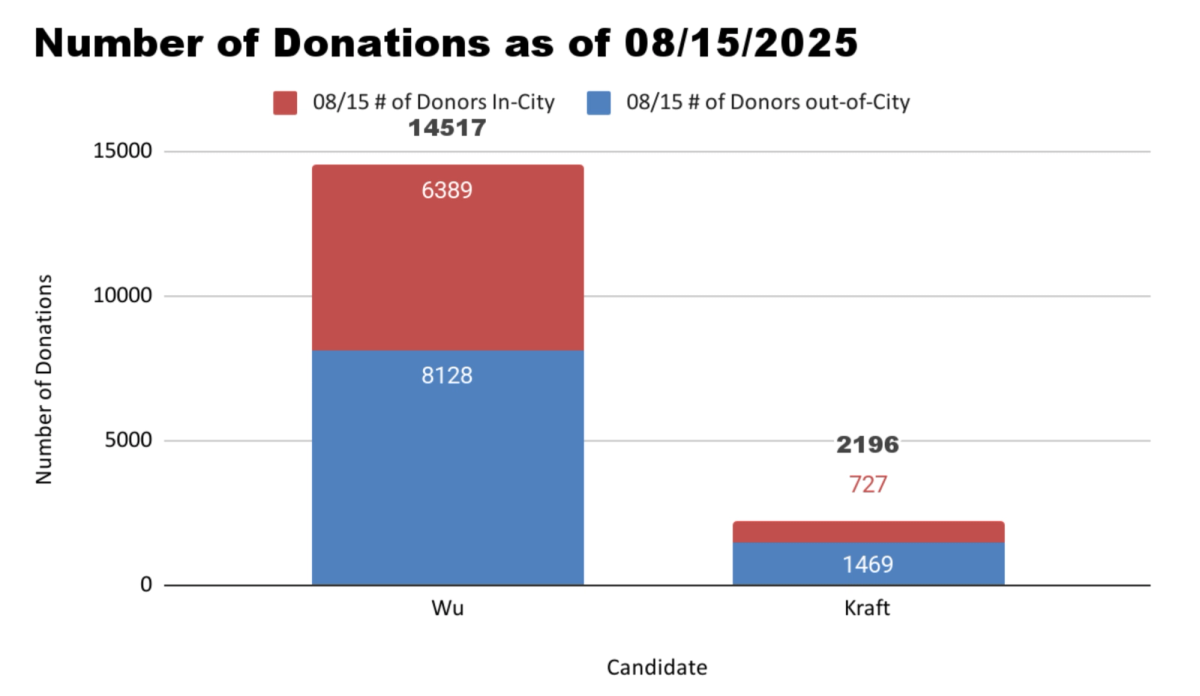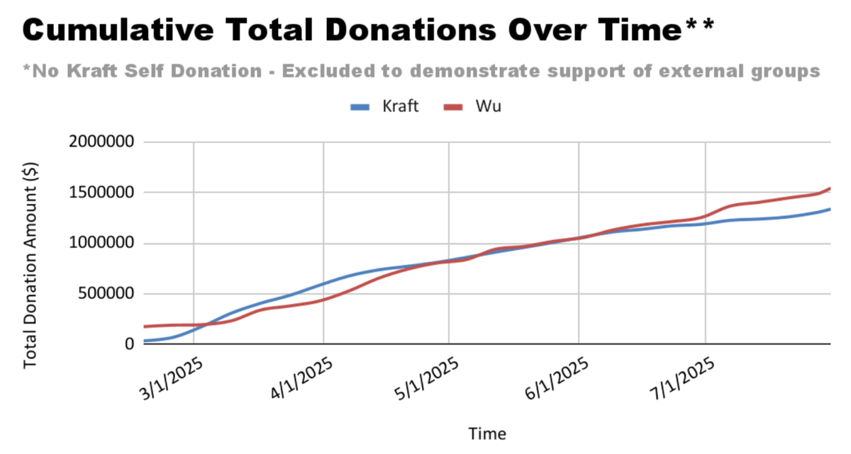 This historical data supports the significance of Wu’s advantage in terms of the number of early donations. Wu’s abundance of donors—together with their persistent support with often multiple donations—by mid-August is a sign of strong support for the upcoming election. Kraft’s reliance on fewer, but wealthier donors, as well as a large amount of self-funding, may not represent the same kind of voter momentum that Wu’s campaign has.