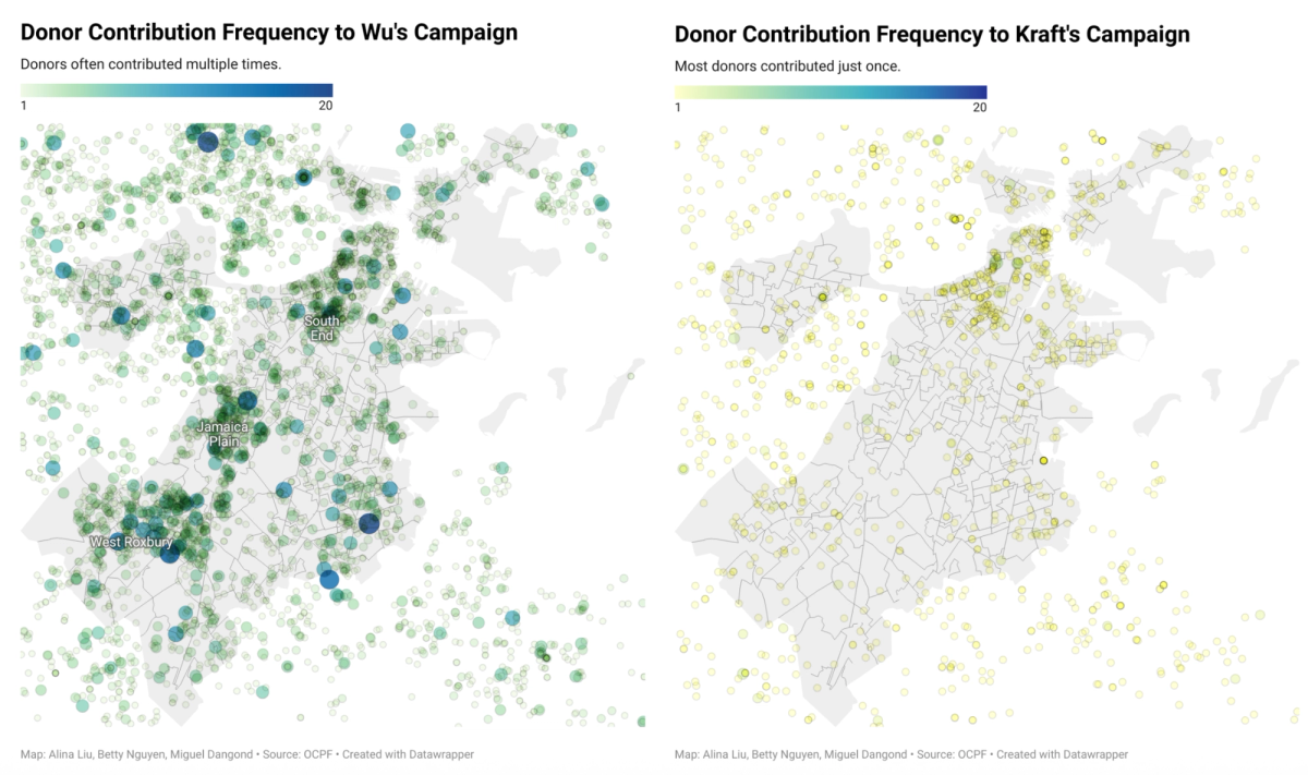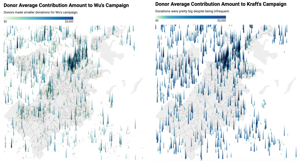 Though the maps may look similar at first glance, you may notice that individual donations to Kraft’s campaign tend to be heftier than those made to Wu’s.