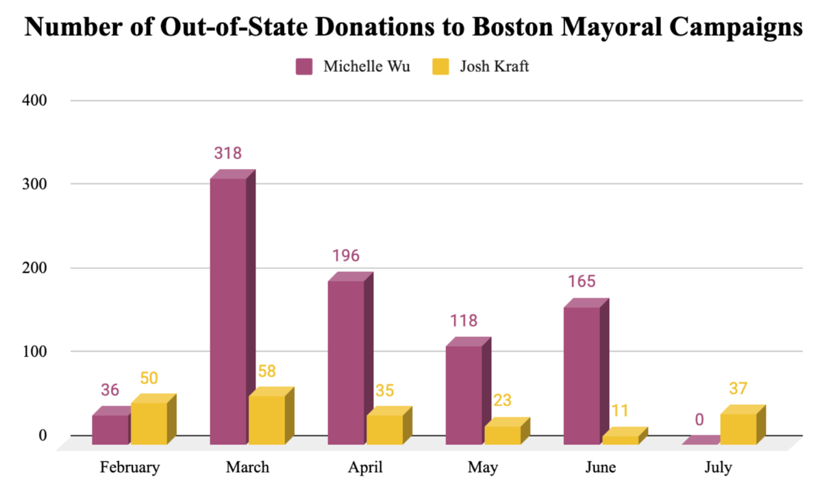 On the other hand, Kraft raised $1.35 million from over 2,100 donors, which suggests there are significantly fewer people giving larger amounts of money. Only 29% of his donations came from donors within Boston. The remainder of donations came from out-of-city supporters.