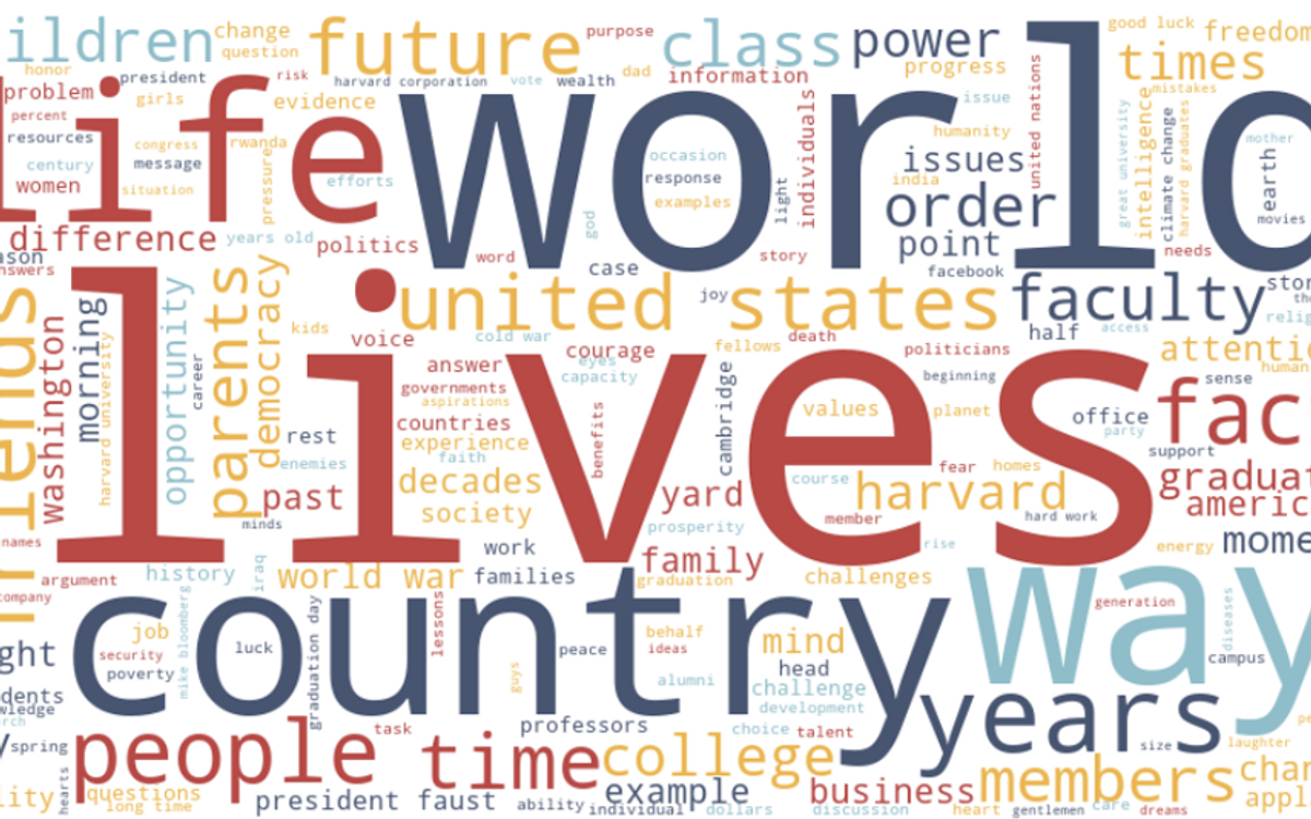 From our analysis of how common words and phrases in a given commencement speech mirrored relevant events occurring in the world, we found that commencement speeches did reference world events in a significant way, consistent with Harvard’s larger mission “to educate the citizens and citizen-leaders for our society.”
