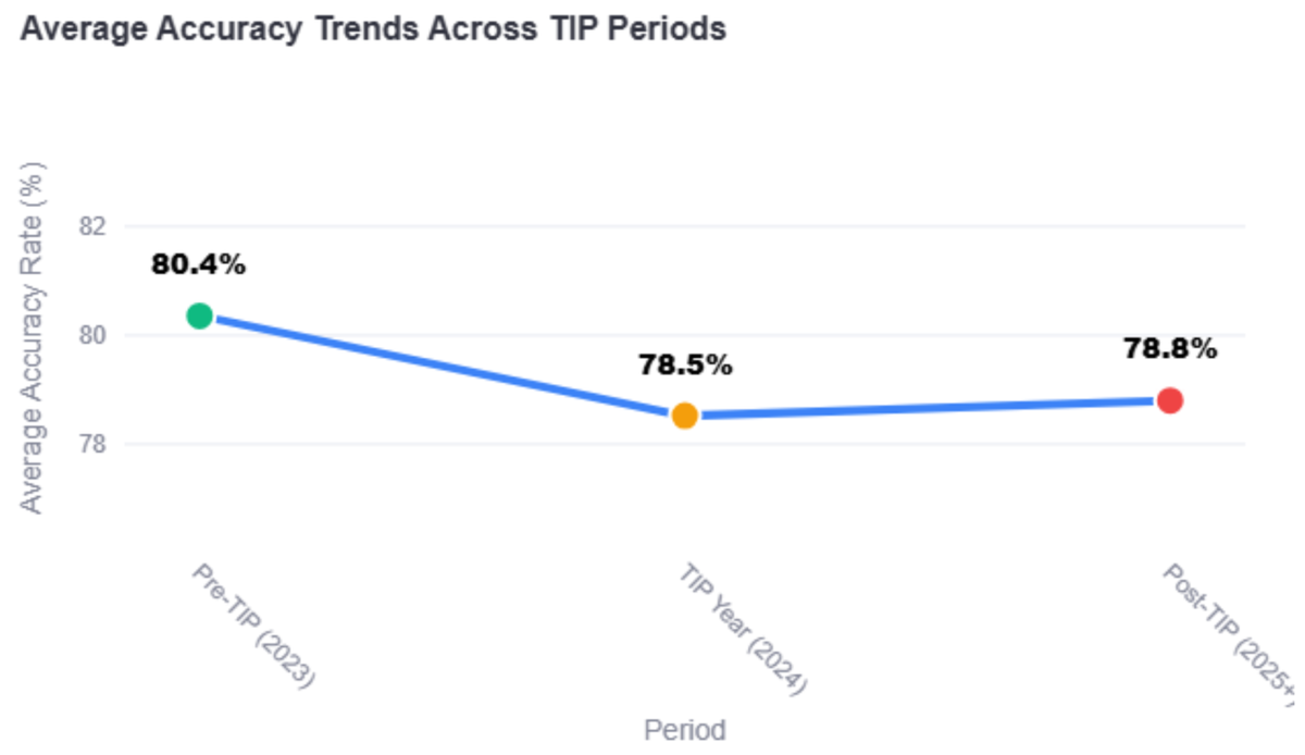 Figure 4: Average prediction accuracy over time.TIP appeared to have a minimal impact on the average accuracy of train time predictions. Before TIP, the average accuracy was 80.4%, dropping during TIP construction, and then rising slightly to 78.8%. Since the MBTA’s prediction accuracy is 1.6% less than pre-TIP, the prediction accuracy seems to be unaffected (or even slightly negatively affected) by TIP.
