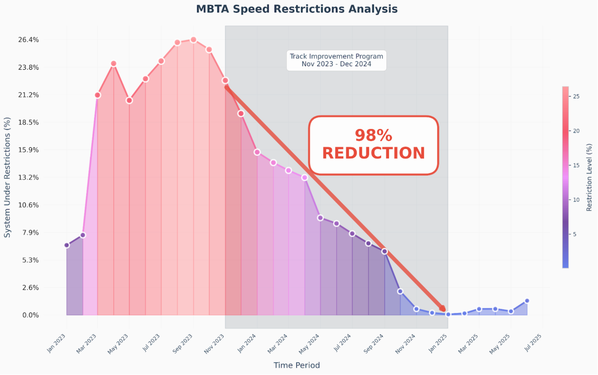 The 98% reduction in speed restrictions in the MBTA suggests that TIP upgrades did have a significant effect in allowing trains to go faster.